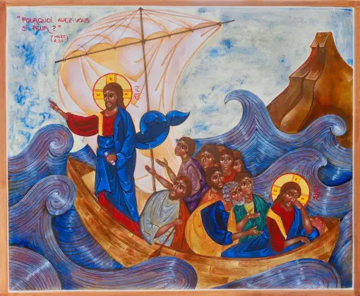 Nous savons aussi ce que représente cette barque dans laquelle Jésus est montée avec ses apôtres : C’est l’Église ! Qu’avons-nous à craindre si nous sommes éveillés avec Jésus dans la barque ? Au cœur des pires détresses, Jésus est là, toujours là, avec nous. Nous ne risquons rien. Le danger devient réel si nous dormons nous-mêmes, car nous sommes responsables de nos vies. Si nous dormons, nous pouvons risquer de passer par dessus bord et de boire la tasse. C’est pourquoi le Seigneur nous a recommandé de veiller, d’être vigilants. Mais que Jésus dorme… ce n’est pas un problème. Il est des situations où l’on peut avoir l’impression que Jésus dort, que l’on ne le sent plus présent ni agissant, alors que nous nous débattons. Ne craignons pas ces états, Il est là près de nous, même si nous ne le sentons pas.